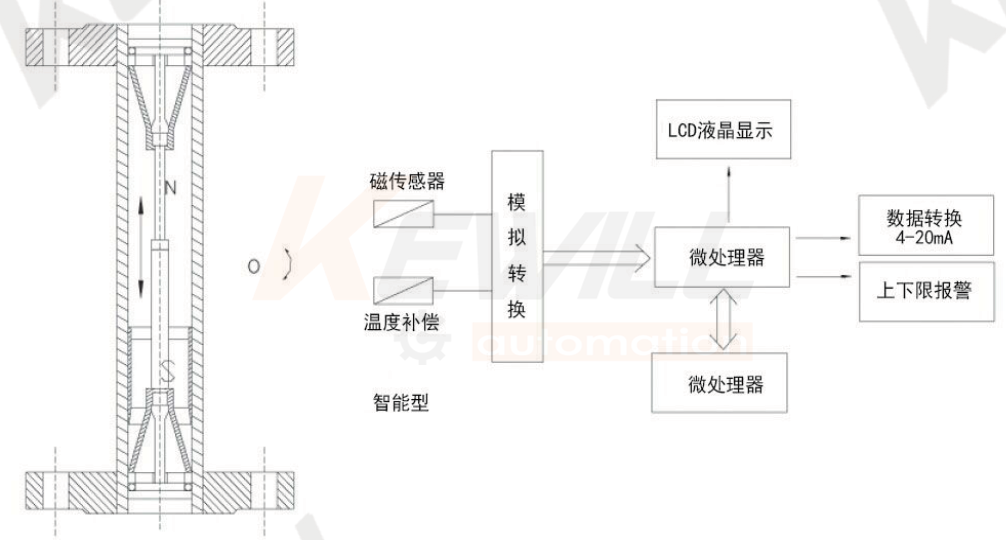 由智能型指示器中的隨動磁鋼與浮子內磁鋼耦合,而發生轉動,同時帶動傳感磁鋼及指針,通過一個磁 傳感器將磁場變化轉化為電信號,經A/D轉化,數字濾波,溫度補償,微處理器處理,D/A輸出,LCD液晶顯示,來顯示出瞬時流量及累積流量大小。(如下圖所示) |