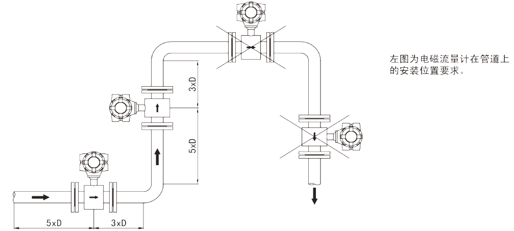 為了在不同的應用條件下確保說明書所表述的精度,安裝傳感器時應從電極面上游安裝五倍管徑的直管段,下游安裝三倍管徑的直管段,見下圖所示。這種安裝可以充分排出由于彎管、閥門或縮頸引起的干擾。當流量計前后的直管段不能滿足要求時,性能指標會有一定偏差。
