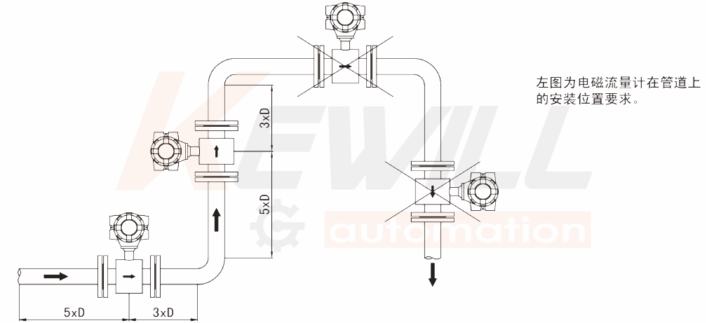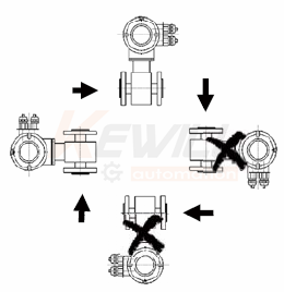為了在不同的應(yīng)用條件下確保說明書所表述的精度,安裝傳感器時(shí)應(yīng)從電極面上游安裝五倍管徑的直管段,下游安裝三倍管徑的直管段,見下圖所示。這種安裝可以充分排出由于彎管、閥門或縮頸引起的干擾。當(dāng)流量計(jì)前后的直管段不能滿足要求時(shí),性能指標(biāo)會有一定偏差。