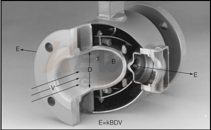 測量流量時,導電性液體以速度V流過垂直于流量方向的磁場,導電性液體的流動感應出一個與平均流速成正比的電壓,其感應電壓信號通過二個或二個以上與液體直接接觸的感應電極檢出,并通過電纜送至轉換器通過其智能化處理,實現流體瞬時流量、積累流量的顯示及流量數據與控制系統之間的通訊。測量管內無活動及阻流部件,因此幾乎沒有壓力損失,并且有很高的可靠性。