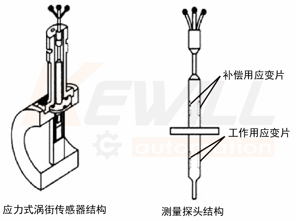 渦街流量計是利用卡門渦街原理進行測量的,在測量管中垂直插入一個柱狀物,流體通過柱狀物時,一定條件下,在柱狀兩側就會交替產生兩列有規則的旋渦,如下圖所示意,這兩列旋