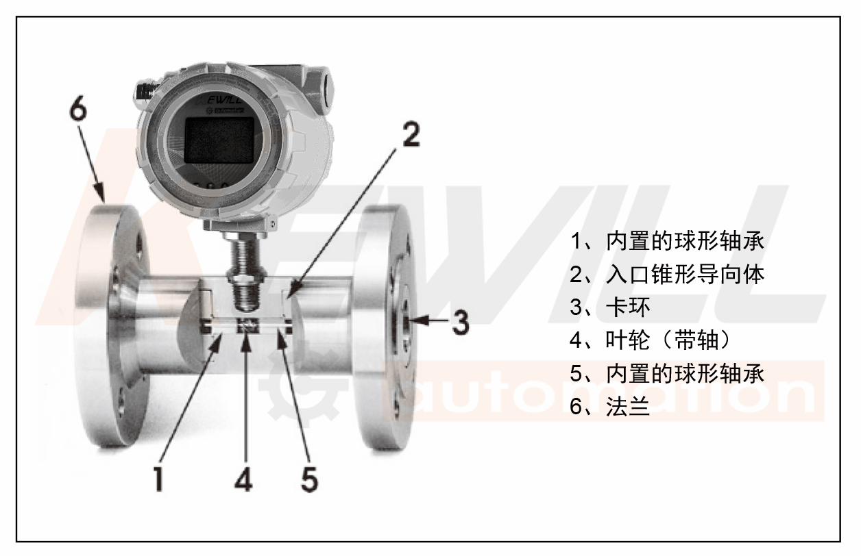 渦輪的轉速通過裝在機殼外的傳感線圈來檢測。當渦輪葉片切割由殼體內永久磁鋼產生的磁力線時,就會引起傳感線圈中的磁通變化。傳感線圈將檢測到的磁通周期變化信號送入前置放大器,對信號進行放大、整形,產生與流速成正比的脈沖信號,送入單位換算與流量積算電路得到并顯示累積流量值;同時亦將脈沖信號送入頻率電流轉換電路,將脈沖信號轉換成模擬電流量,進而指示瞬時流量值。