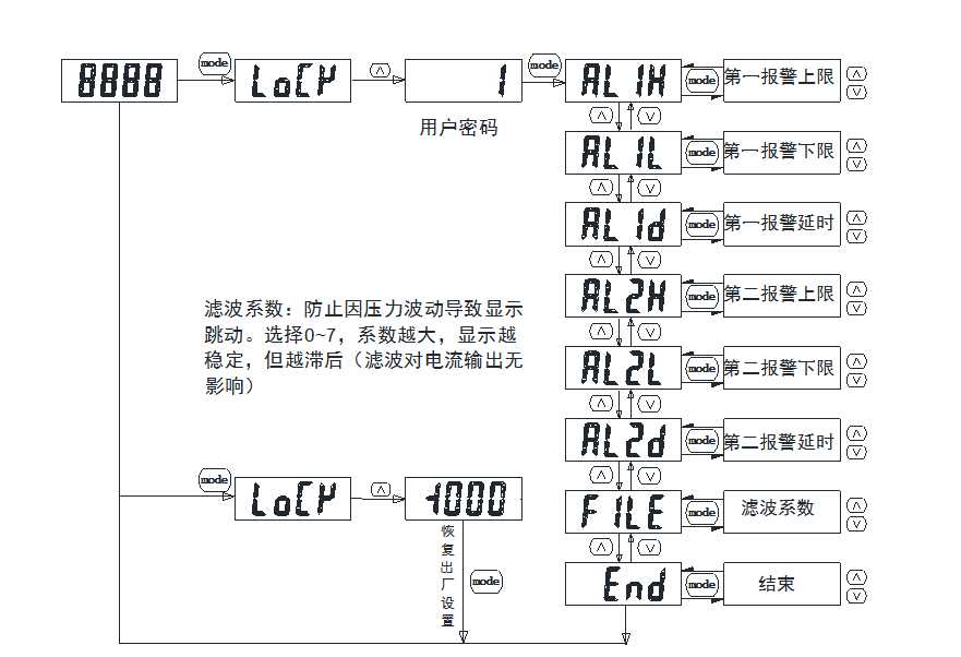 注:在測量狀態下按壓mode鍵,顯示“LOCK”提示輸入模式密碼,按▲或▼鍵輸入密碼“1”,按mode鍵確認進入菜單,切換使用▲或▼切換。菜單為循環結構,可以向上、向下翻。在 “END” 菜單下按mode鍵保存退出。數據查看通過mode鍵,修改通過▲或▼鍵實現,確認請再次按下mode鍵。