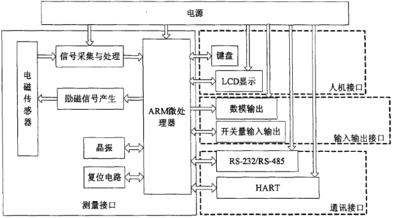 基于ARM的電磁流量計轉換器的硬件主要由以下幾部分組成(見下圖):輸入輸出接口、流量測量接口、通訊接口和人機對話接口。 輸入輸出接口包括數字模擬輸出和開關量輸入輸出; 流量測量接口包括信號采集與處理、激勵信號產生和AKM微處理器; 通訊接口包括RS-232、RS-485和HART; 人機界面包括鍵盤和液晶顯示器。